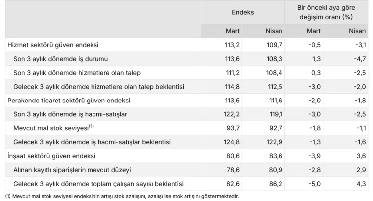 ANKARA (İGFA) - Türkiye İstatistik Kurumu tarafından açıklanan Nisan 2026 dönemi hizmet, perakende ticaret ve inşaat sektörü güven endeksleri, ekonomide sektörler arası farklı seyri ortaya koydu.