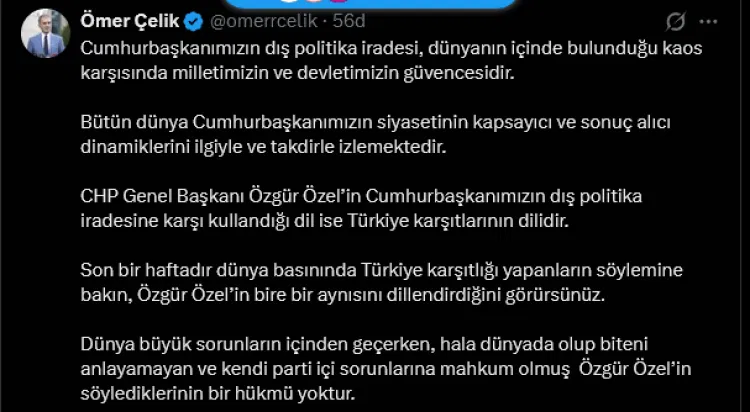 ANKARA (İGFA) - AK Parti Genel Başkan Yardımcısı ve Parti Sözcüsü Ömer Çelik, Cumhurbaşkanı’nın dış politika iradesine yönelik eleştirilerde bulunan CHP Genel Başkanı Özgür Özel’e tepki gösterdi.